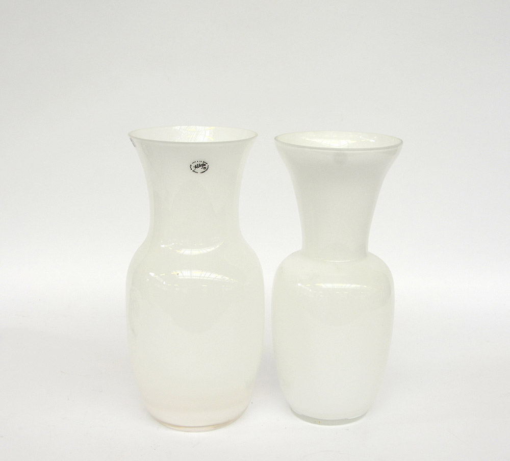 Lotto composto da due vasi in vetro bianco opacizzato (h cm 30,5)