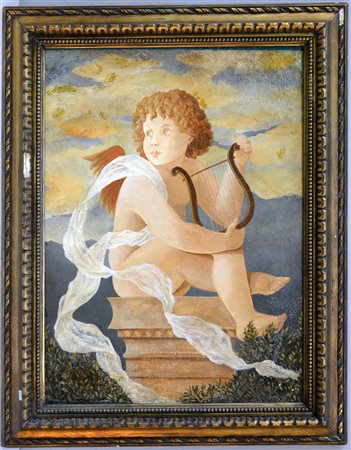 Ignoto "Angelo con cetra" olio su tavola (cm 60x44) In cornice (difetti)