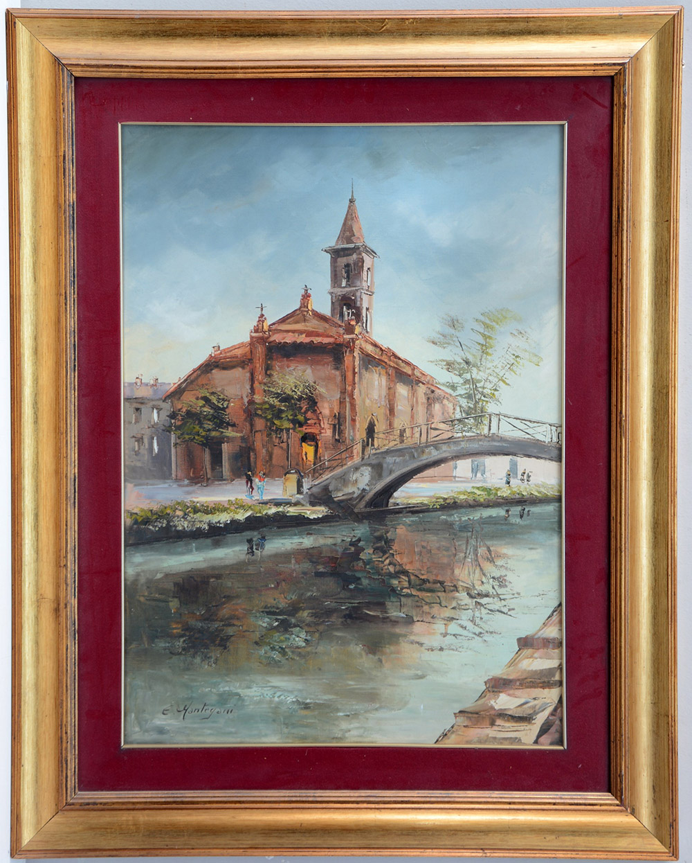 Eugenio Mantegani Milano 1929 2005 "Milano, San Cristoforo" olio su tela (cm 70x50) Firmato in basso a sinistra. Al retro: firmato, titolato e autenticato con il n. 265 come da iscrizione (in cornice)