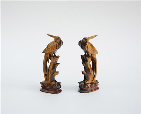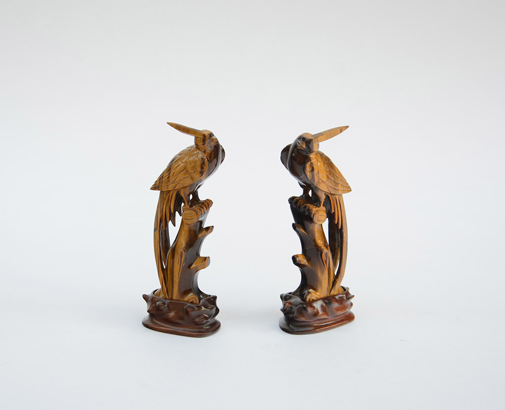 Coppia di volatili in occhio di tigre, con basi in legno (difetti) (h. 19 cm.)