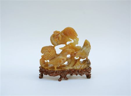 Gruppo in pietra dura con galli, con base in legno Cina, sec. XX (h. 23 cm.)