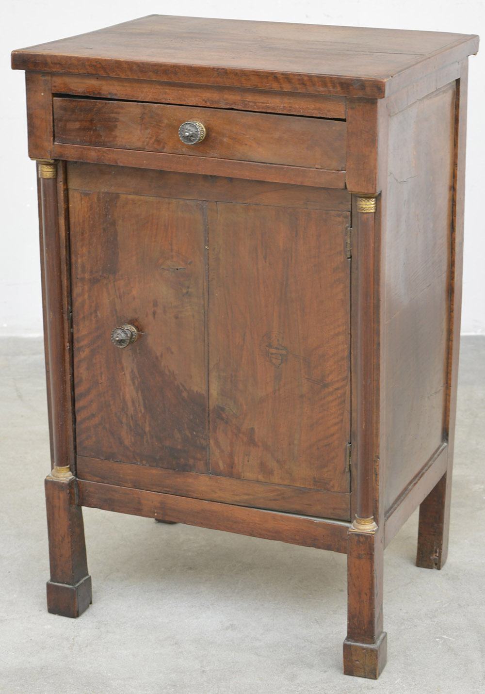 Comodino in noce ad un'anta ed un cassetto con montanti a mezza colonna e capitelli dorati. XIX Secolo (cm 55x84x42) (difetti)