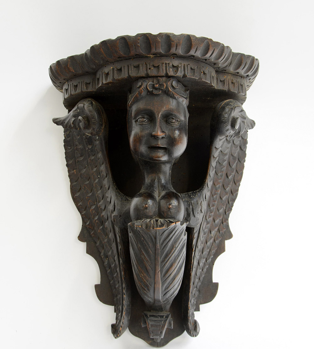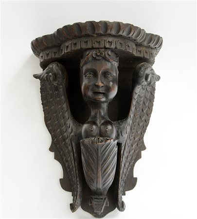Mensola di forma sagomata in legno intagliato a motivo di figura alata (cm 32x41x23) (lievi difetti)