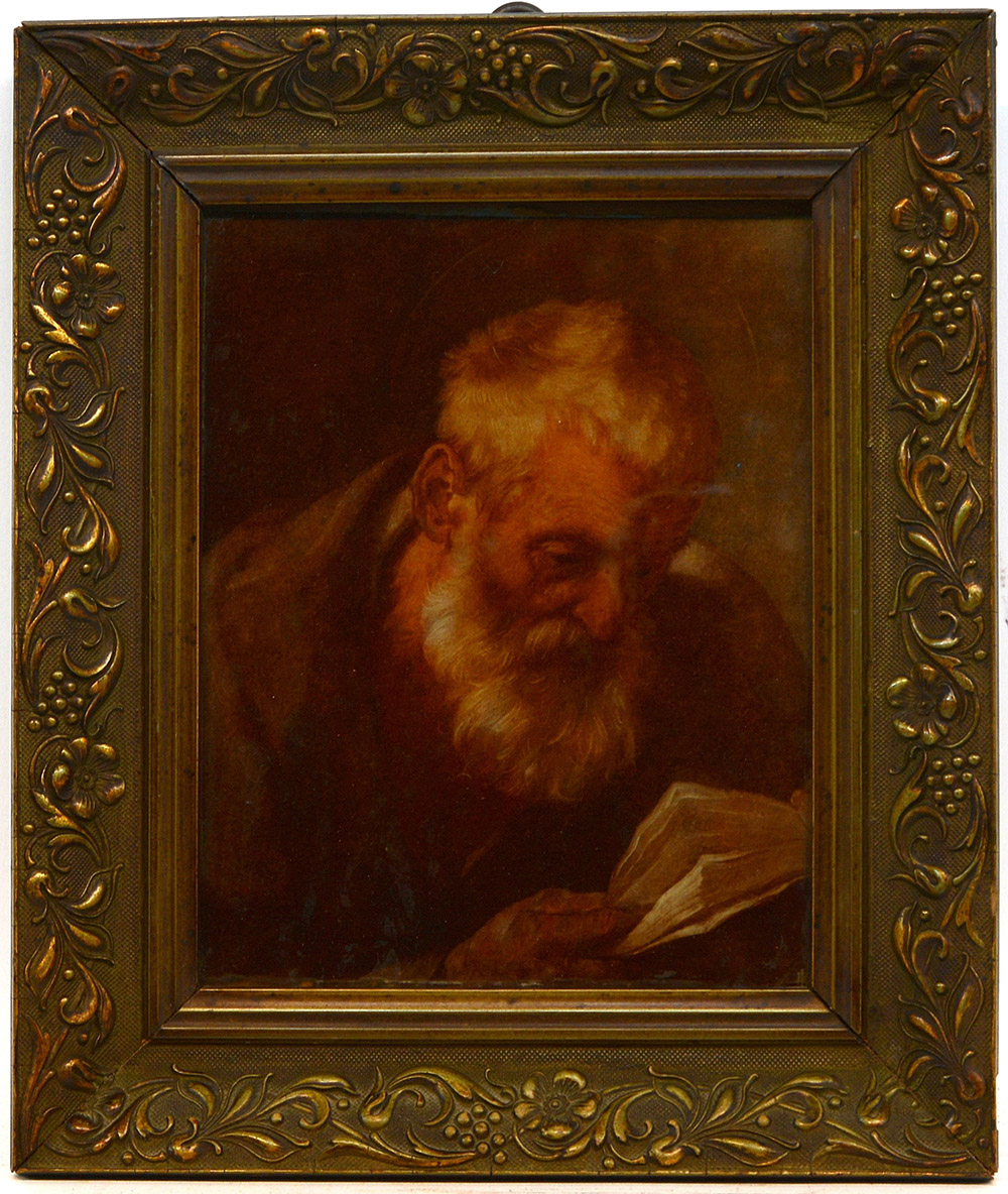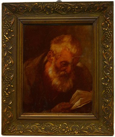 Scuola del secolo XVIII, "Frate che legge", tecnica mista su carta incollata...