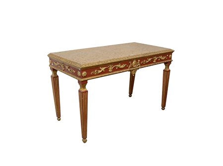 Antica consolle "Luigi XVI" in legno laccato rosso e dorato. Fascia decorata con fregi e rosoni intagliati e dorati. Quattro gambe rastremate e scanalate, piano in marmo rosa (cm 136x82x68) (lievi difetti)