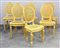 Gruppo di dodici sedie in legno laccato giallo con schienale sagomato e fregio intagliato. Piedi torniti e scanalati. Seduta e schienale in paglia di Vienna