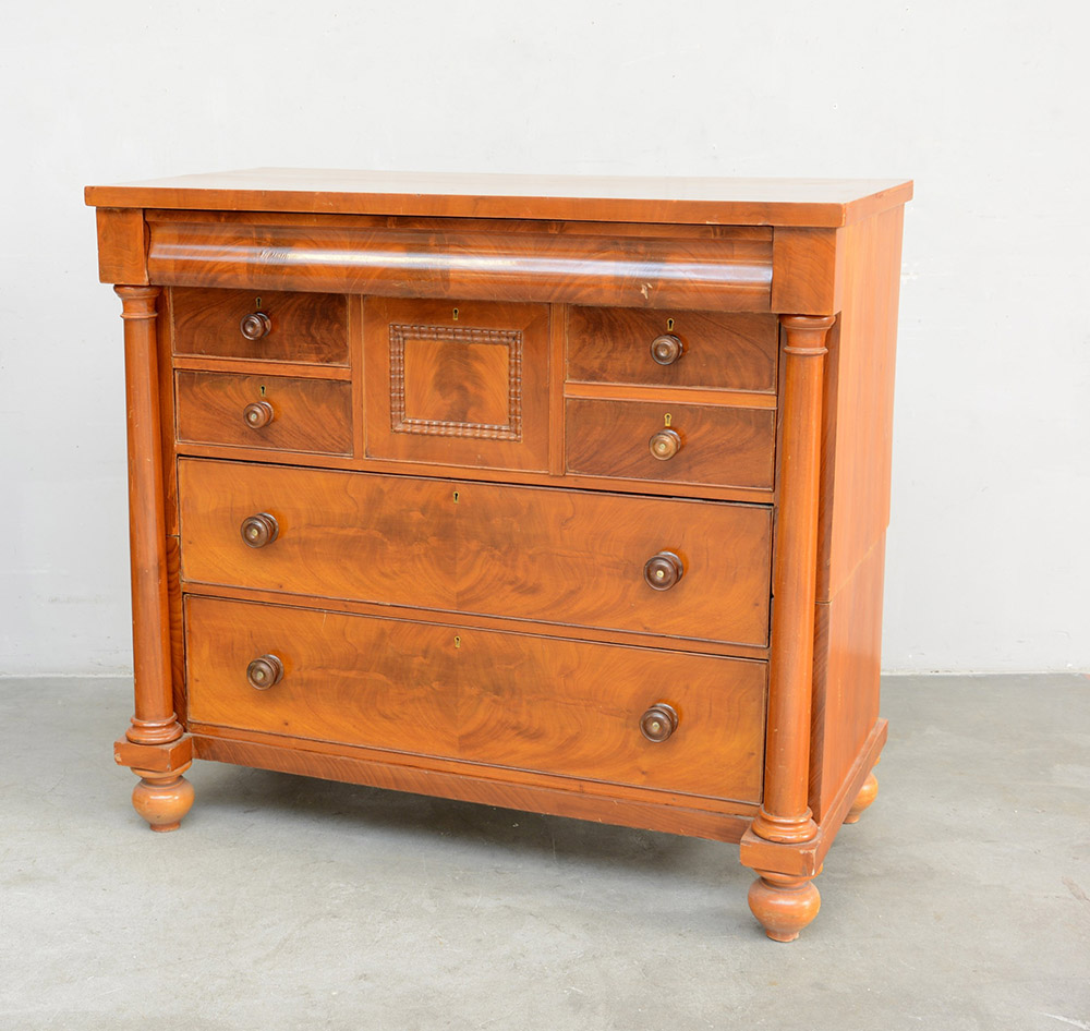 Comò lastronato in mogano a cinque cassetti riquadrati e due grandi nella base. Montanti a colonna tornita (cm 125x115x61)(difetti)