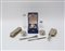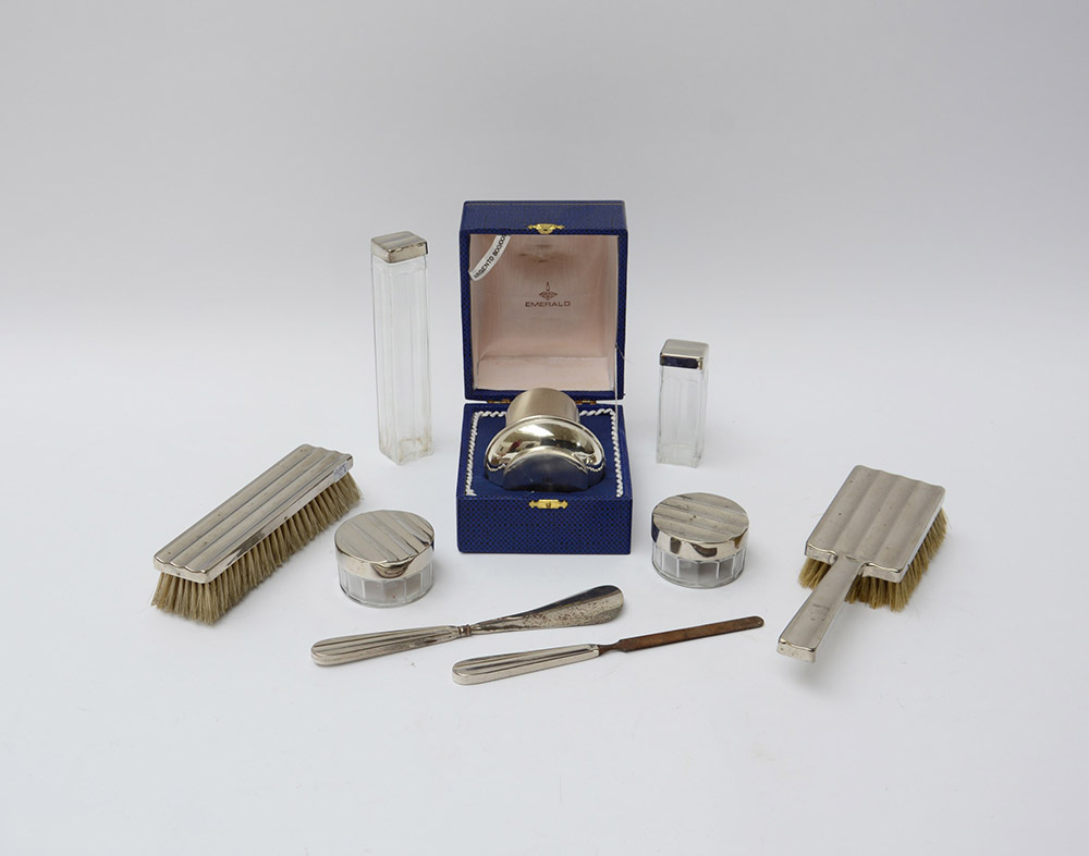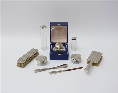 Servizio da toilette in metallo e vetro composto da spazzole, quattro contenitori con coperchio, una lima e un calzascarpe, a cui si unisce un accendisigari da tavolo (difetti)