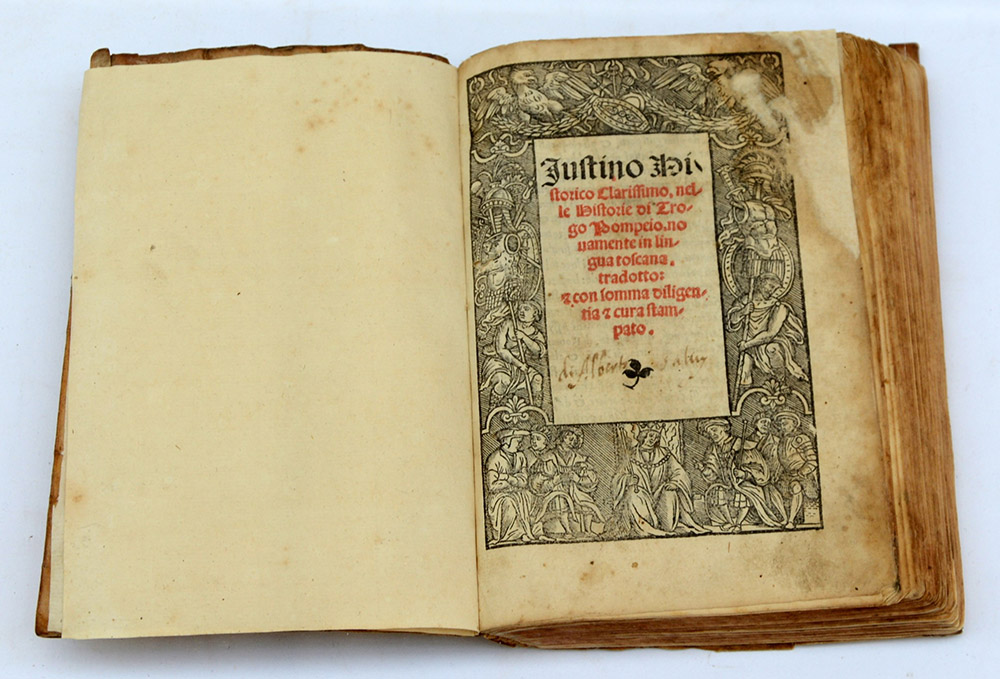 Giustino. Historiae di Trogo Pompeo. Venezia: 1534 (difetti e macchie di umidità). Legatura in piena pergamena coeva.