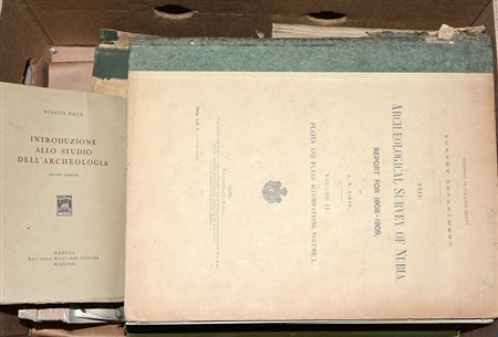 Lotto composto da diverse opere inerenti l'archeologia e la papirologia, fra cui gli 8 volumi del "The Archaeological Survey of Nubia", edito fra il 1910 e il 1927, e i 2 volumi degli "Atti del IV Congresso degli Orientalisti", edito nel 1880-81 (lievi difetti). In cartone.