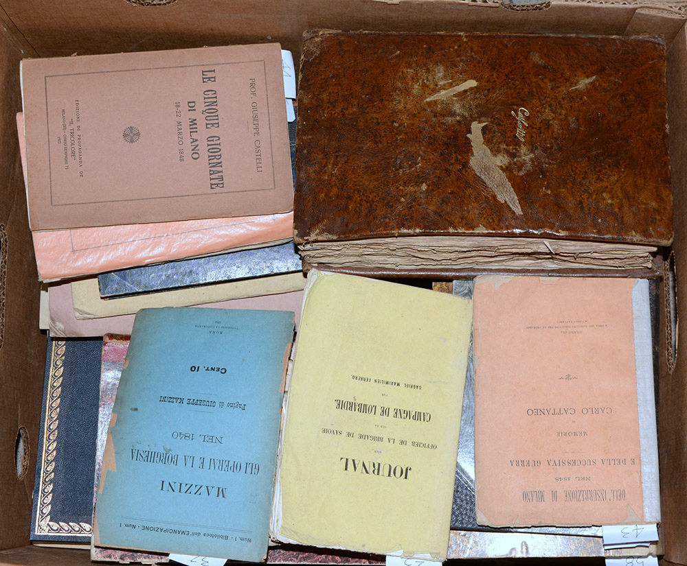 Lotto composto da diverse pubblicazioni inerenti prevalentemente il Risorgimento italiano, fra cui "Il Risorgimento" di Antonio Gramsci (Einaudi, 1954), "Notizie storiche sul Brigantaggio nelle provincie napoletane" di Marco Monnier (Barbera, 1862) (lievi difetti). In cartone.