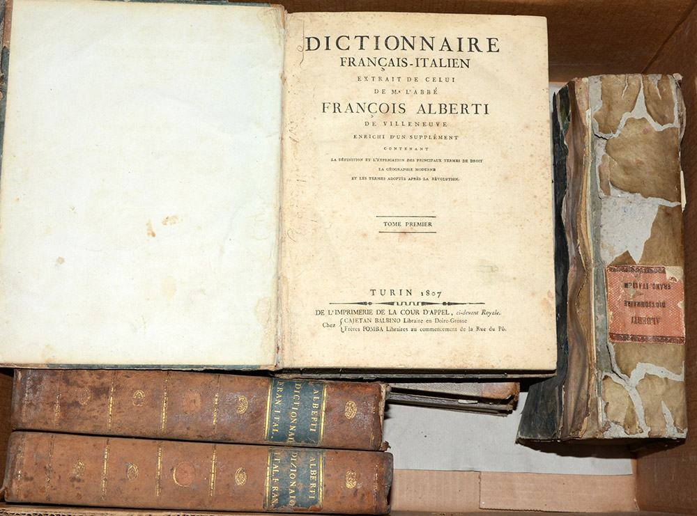 Lotto di svariati vocabolari, fra cui francese-italiano e italiano-francese, greco-latino e latino-greco. Secoli XVII-XIX (difetti). In cartone.