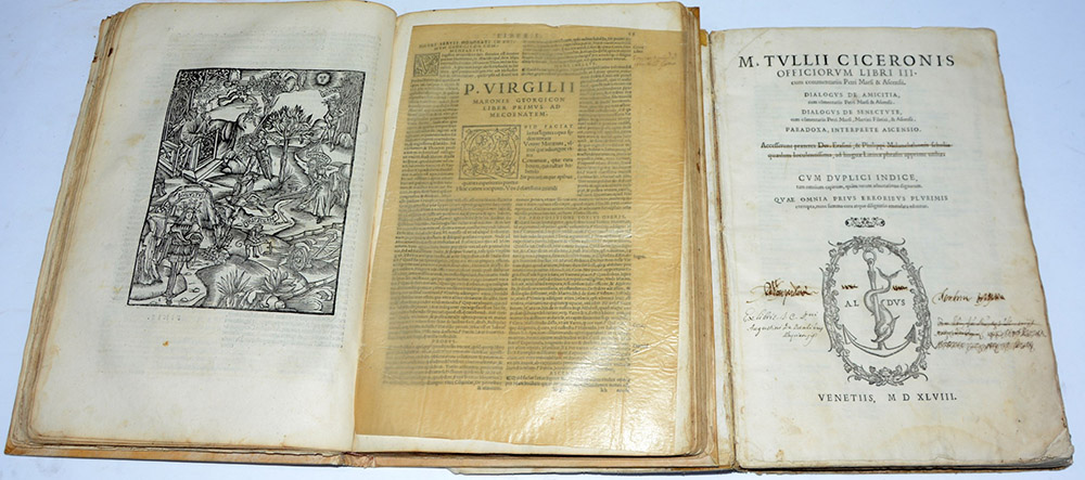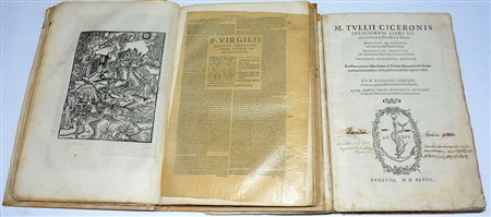 Lotto di due opere: - M. Tulli Ciceronis Officiorum Libri III. Vezia: Aldo Manuzio, 1548. 4to, rilegato in cartone e mezza pergamena (gravi difetti). Ex libris sul contropiatto anteriore e nota di possesso manoscritta al frontespizio. - P. Virgilii Maronis...Bucolica [...] Georgicon. [?]: Giovanni Piero Valeriano, [?]. Legatura recente in pergamena.