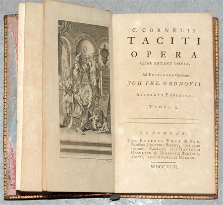Gronovius, Johann Friedrich (1611–1671). C. Cornelii Taciti Opera quae extant omnia. Glasgow: typis Roberti Urie & Soc. sumtibus Johannis Barry [...] 1743. Due volumi rilegati in pelle rossa con decorazioni in oro, taglio dorato (lievi difetti).