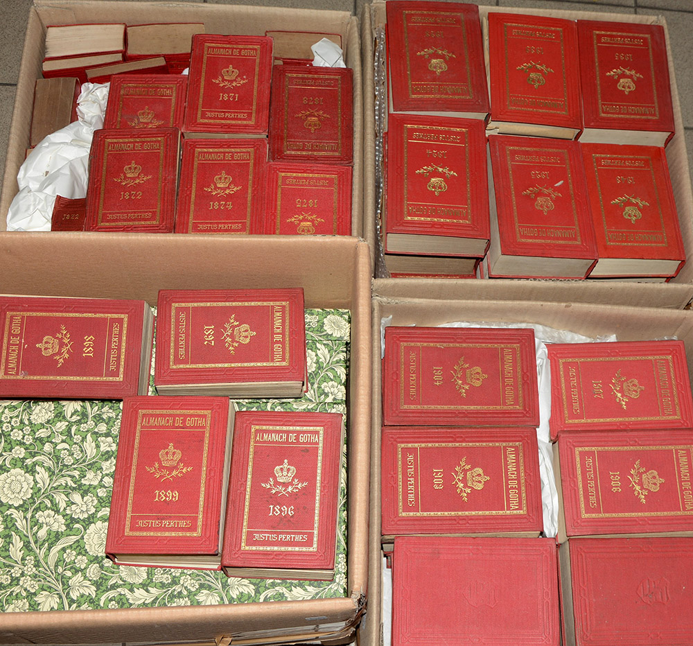 Almanach de Gotha. Numerosi esemplari in dodicesimo e in trentaduesimo relativi agli anni 1781-1943 (alcuni con belle incisioni in antiporta). Lotto in cinque scatole.