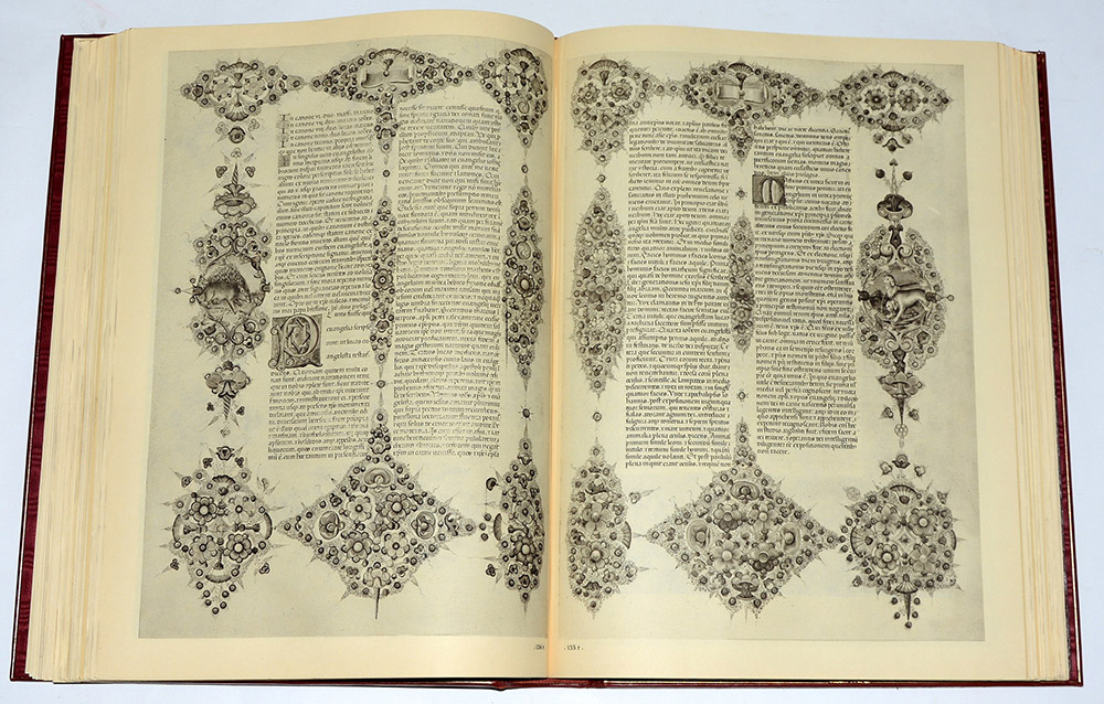 La Bibbia di Borso d'Este. Milano: Emilio Bestetti Editore d'Arte, 1937. Presentano la riproduzione delle pagine della Bibbia in bianco e nero e a colori. Due volumi in folio rilegati in piena pelle rossa con impressioni e titoli in oro. Stemma in bronzo sui piatti anteriori. Esemplare 207/500. In cofanetto.