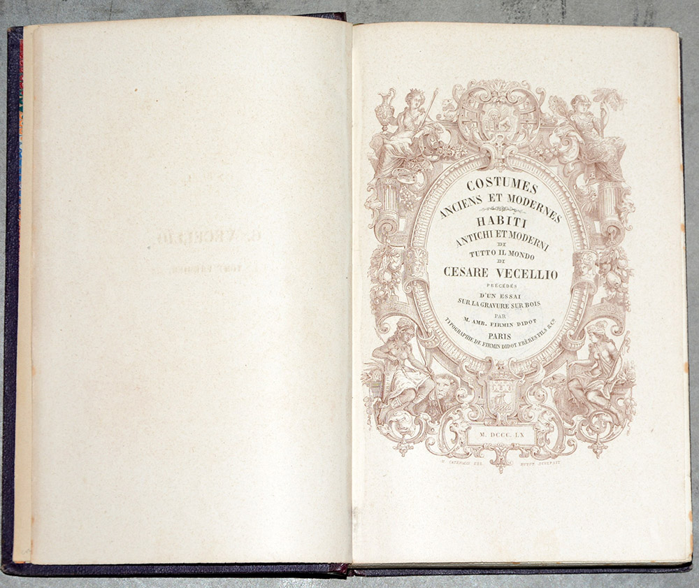 Vecellio, Cesare. Costumes anciens et modernes... Parigi: Typographie de Firmin Didot, 1860. Due volumi con numerose illustrazioni in bianco e nero. Legatura in mezza pelle (lievi difetti).
