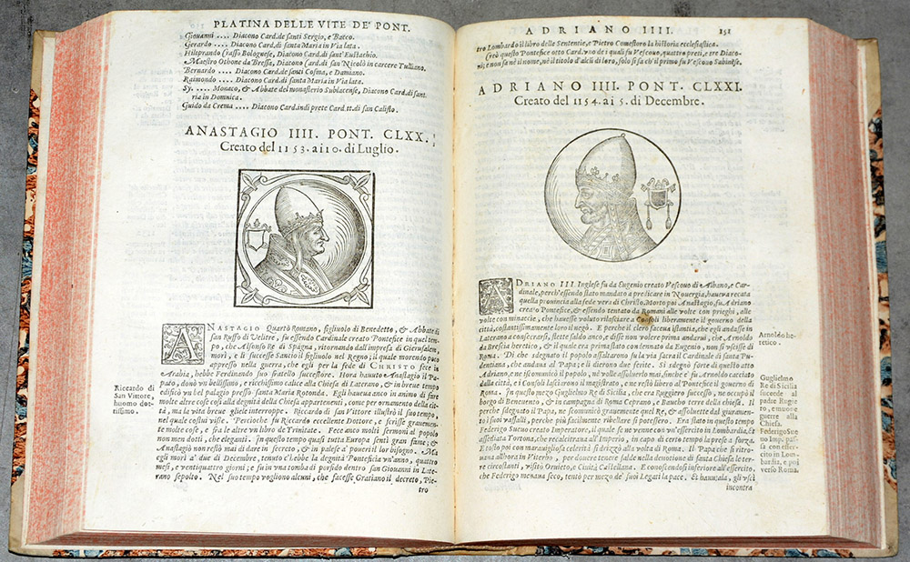 Platina, Battista. Historia delle Vite dei Sommi Pontefici, dal Salvator Nostro sino a Clemente VIII. Venezia: Bernardo Basa, 1594. Nello stesso volume anche Panvinio, Onofrio. La cronologia ecclesiastica. Venezia: Bernardo Basa, 1594. Marche tipografiche al frontespizio, iniziali e fregi xilografati. Legatura moderna in mezza pergamena e piatti cartonati (lievi difetti).