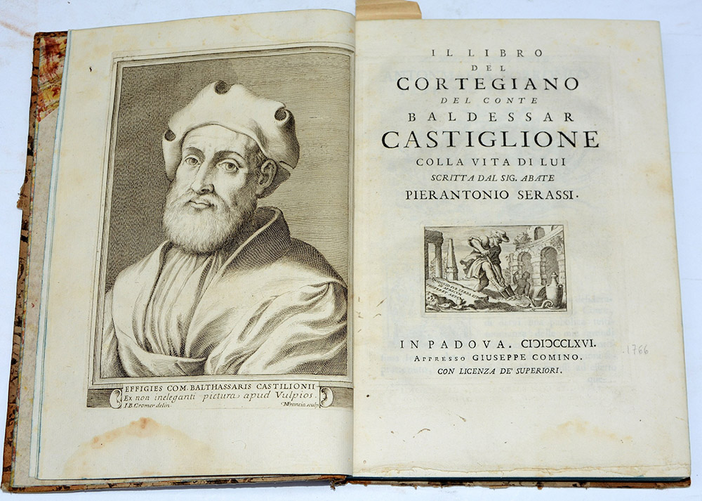 Il Libro del Cortegiano del Conte Baldessar Castiglione... Padova: Giuseppe Comino, 1766. Bel ritratto in antiporta, marca tipografica al frontespizio, stemma di Antonmaria Borromeo, al quale l'opera è dedicata dal Comino, iniziali incise. Legatura in mezza pelle e piatti cartonati, taglio azzurro (tracce di tarli).