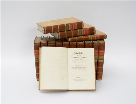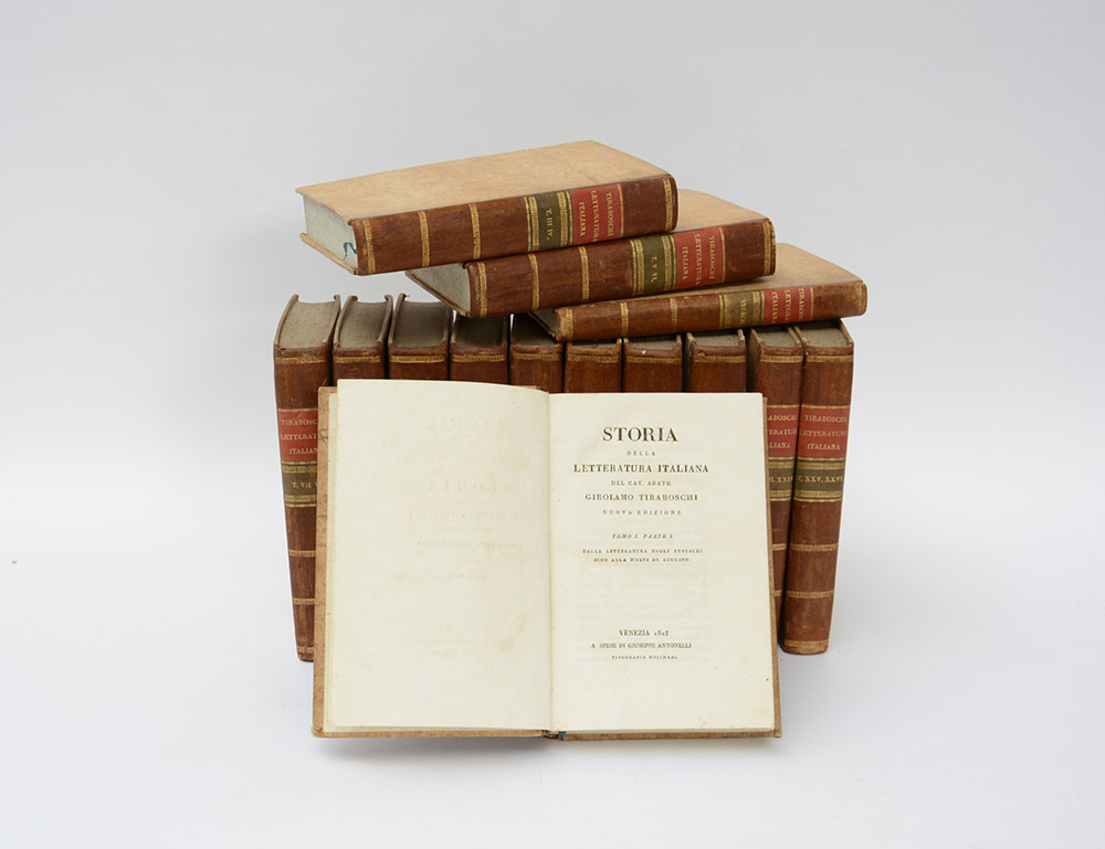TIRABOSCHI, Girolamo. Storia della letteratura italiana. Venezia: Tipografia Molinari, 1823-25. 14 volumi in 4to. Legatura in mezza pelle, taglio a spruzzo azzurro.
