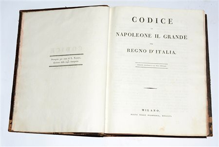 Codice di Napoleone il Grande per Regno d'Italia. Milano: Reale Stamperia, 1806. 4to, testo il italiano e francese, disposto su due colonne. Legatura in piena pelle coeva, taglio rosso (lievi difetti).