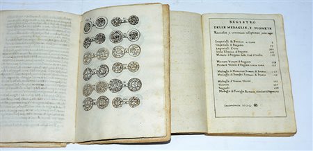 Un volume manoscritto vergato nel 1785 contenente il compendio dell'opera: Carli, Gian Rinaldo. Delle monete e dell'instituzione delle zecche d'Italia dell'antico. Mantova, 1754. Si aggiunge un altro volume manoscritto contenente il Registro delle emdaglie e delle monete, redatto nel 1772. Entrambi i volumi contengono bellissime riproduzioni a mano di antiche monete e medaglie (lievi difetti).
