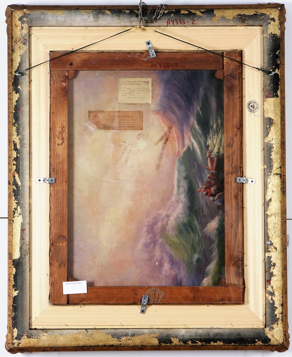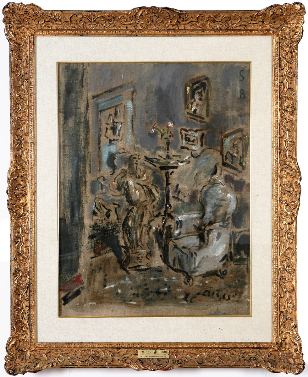 In alto a destra sigla SB. Firma e data in basso a destra. Opera archiviata presso "Catalogo dell' opera di Filippo De Pisis" come da documentazione fotografica allegata riportante numero di repertorio, controfirmata da Luciano Caramel, Claudia Gianferrari e Filippo Tibertelli De Pisis. Opera pubblicata sul catalofo della mostra "Fiori al Campo dei Fiori, 1900-1980, fiori e natura morta" tenuta presso la "Nuova Galleria Campo dei Fiori, Roma" nel dicembre 2004. Catalogo allegato all'opera. Al retro reca i cartgli della Galleria La Bussola, Torino e del Gran Premio Saint Vincent per le arti figurative 1948, Casino de la Valèe - Saint Vincent, Val D'Aosta. Cornice presente.