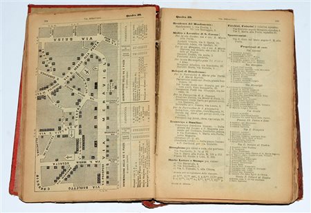 SAVALLO, Gaetano. Guida di Milano pel 1884. Milano: Uffici della Guida, 1884. Simpatica guida in 4to, con attività e piantine geografiche dell'epoca. 4to. Legatura originale in tela rossa e decorazioni a impressione in nero (dorso molto compromesso).