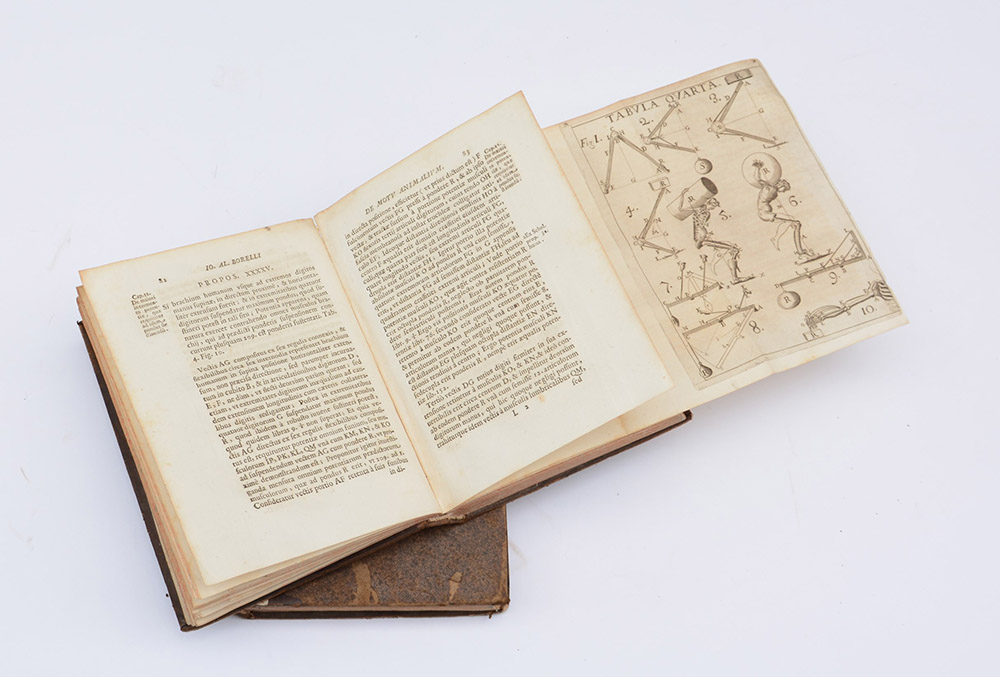 BORELLI, Giovanni Alfonso (1608-1679). De motu animalium. Rome: Angelo Bernabo, 1680-81. 2 volumi, 4to (213 x 155mm). Marche tipografiche al frontespizio, 12 tavole incise in rame ripiegate, capilettera incisi in legno (mancano 6 tavole, qualche fioritura e provenienza rimossa ai titoli). Legatura coeva in pelle. PRIMA EDIZIONE. Il matematico Borelli fu uno dei fondatori della biomeccanica per la quale il corpo è concepito come una macchina i cui movimenti e fenomeni possono venire spiegati attraverso le leggi della fisica. In questi importante trattato l'autore applica la teoria galileiana al movimento dei corpi animali.