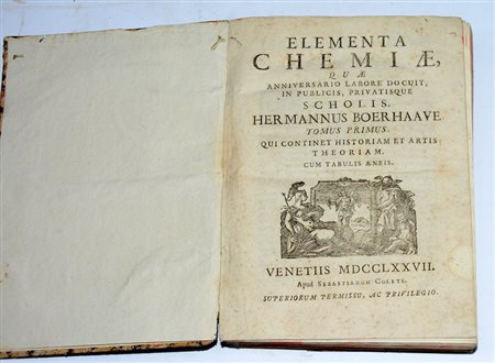 H. Boerhaave. Elementa Chemiae. Venezia: Apud Sebastianum Coleti, 1777. Volume I, con diciassette tavole incise fuori testo. Legatura cartonata lievemente usurata.