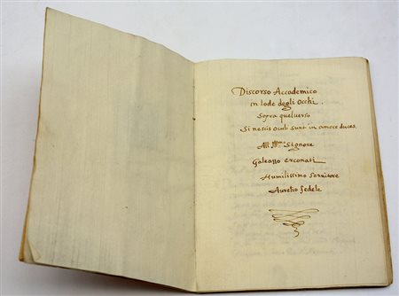 Aurelio Fedele. Discorso Accademico in lode degli occhi... All'Illustrissimo signore Galeazzo Arconati. Manoscritto cartaceo. Secolo XVI. Legatura in piena pergamena (coeva?).