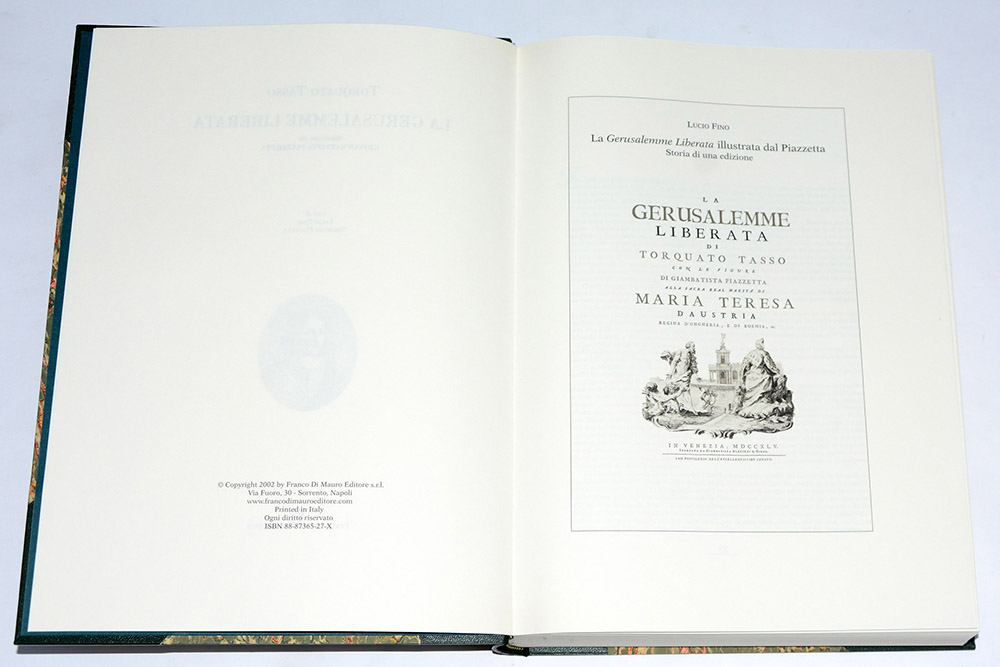 TASSO, Torquato. La Gerusalemme Liberata. illustrata da Giovan Battista Piazzetta. Facsimile della prima edizione del 1745. Franco di Mauro, 2002. Legatura in mezza pelle e carta marmorizzata, con impressioni in oro.