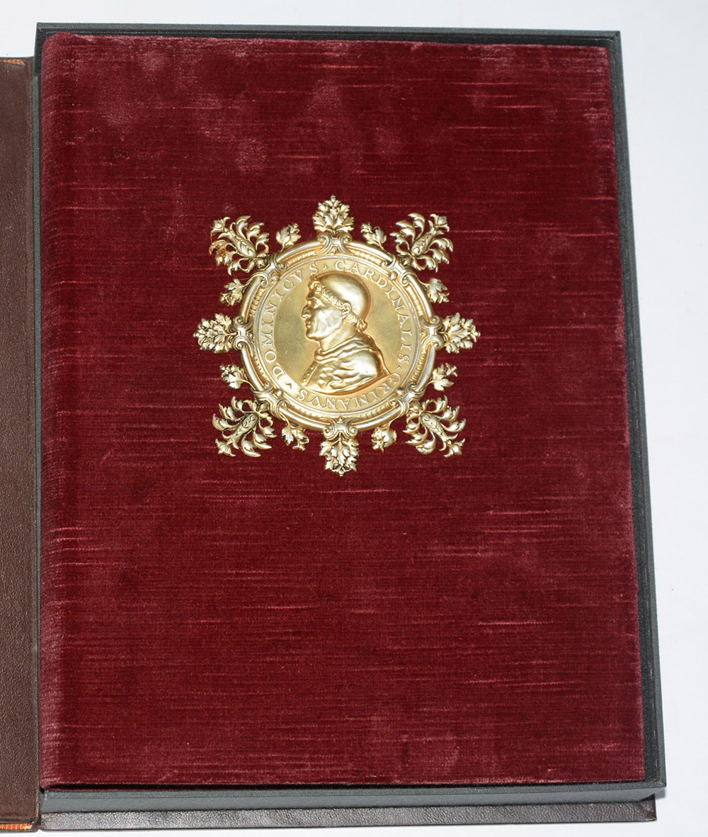 Breviario Grimani. Facsimile del secolo XVI. Electa, [s.d.]. Legatura in velluto bordeaux; sulla coperta anteriore applicato il medaglione dorato raffigurante il busto del Cardinale Grimani. Si allega il Commentario in piena pelle marrone. Entro cofanetto. Esemplare 300/300.