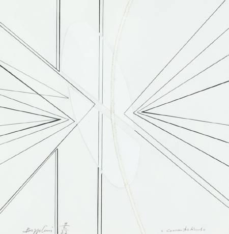 Silvano Bozzolini Fiesole (Fi) 1911 - Parigi 1998 Concentration, 1977 Incisione e collage su carta, cm. 20x20 Firma e data in basso a sinistra, titolo in basso a destra. Sul verso: timbro "Archivio Aurelio Stefanini", Firenze.
