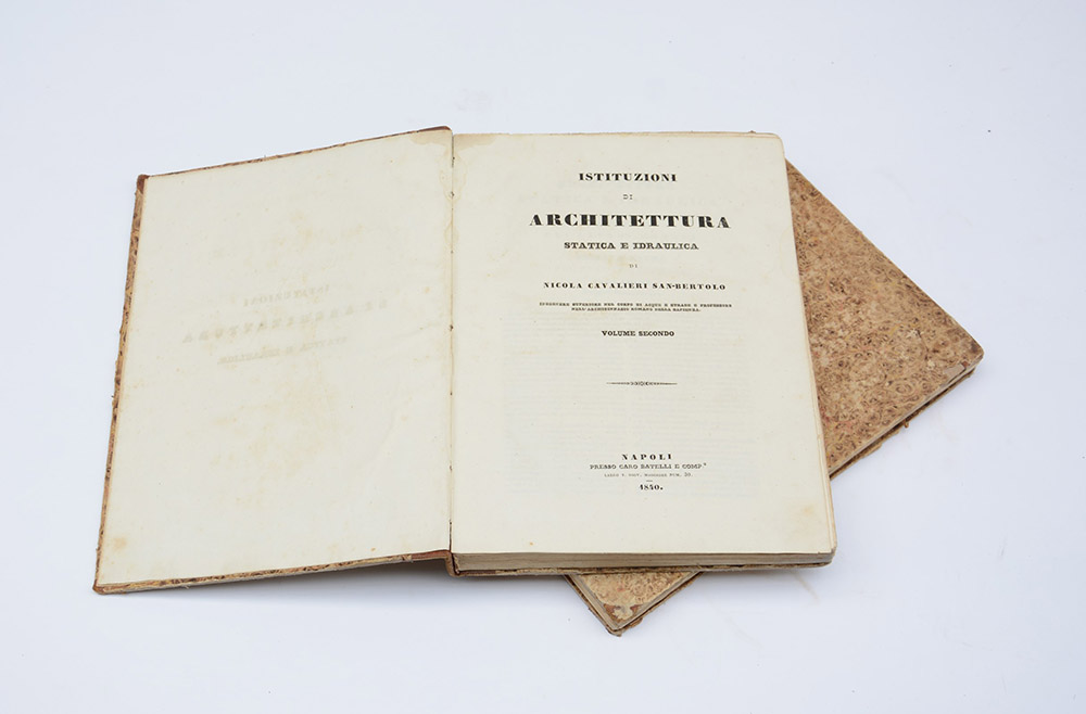 Cavalieri San Bertolo, Nicola. Istituzioni di architettura Statica e Idraulica. Napoli: Caro Batelli e Comp., 1840. Due volumi 4to, con numerose tavole fuori testo. Legatura coeva in mezza pelle e piatti marmorizzati (lievi difetti).