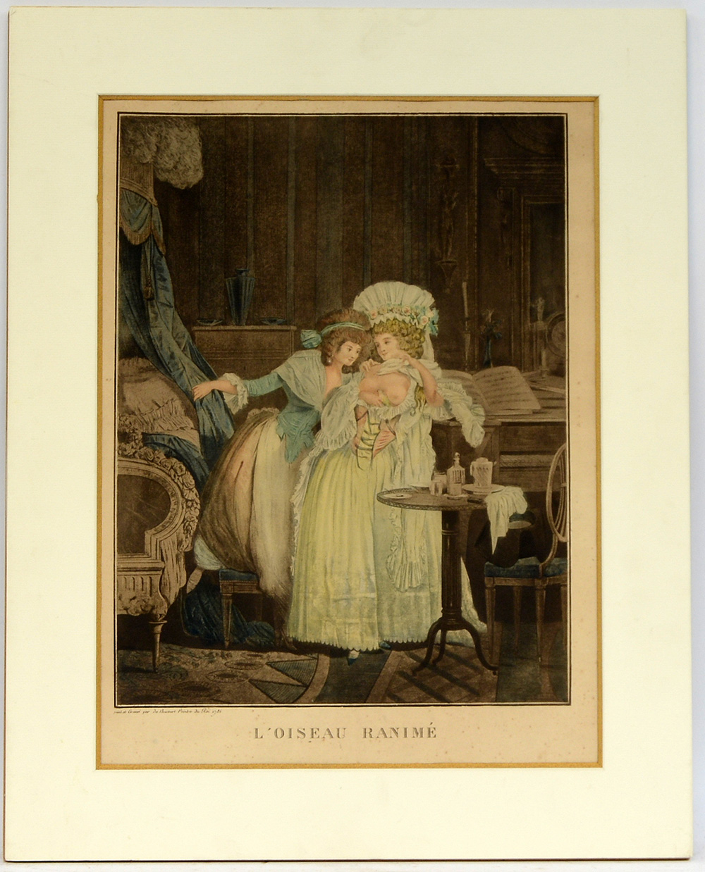 Philibert-Louis Debucourt - "L'oiseau ranimé", acquatinta (foglio cm 47x36,5) (difetti)