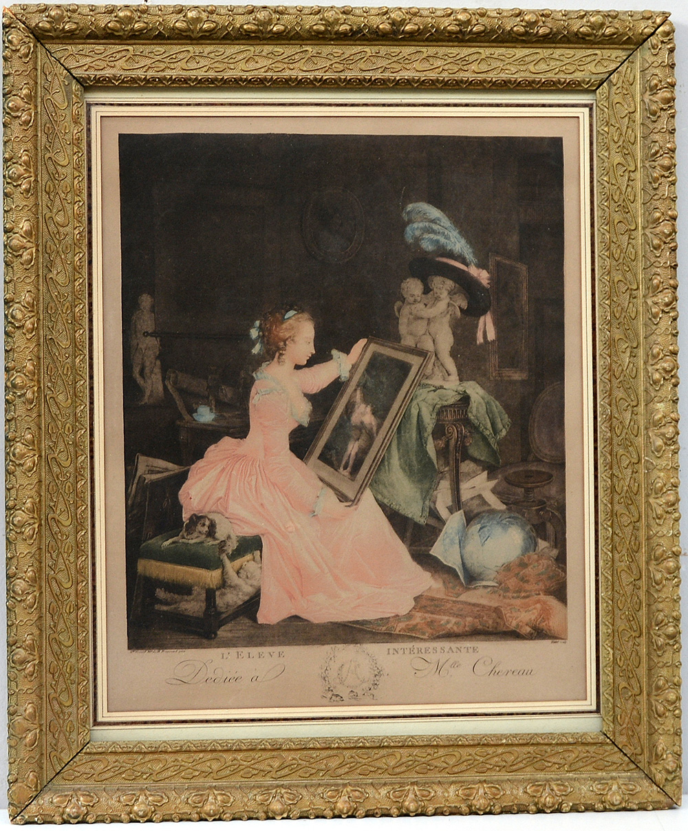 Da Marguerite Gerard, "L'Eleve intéressante", acquatinta di Vidal con dedica (cm 45x36 circa), in cornice
