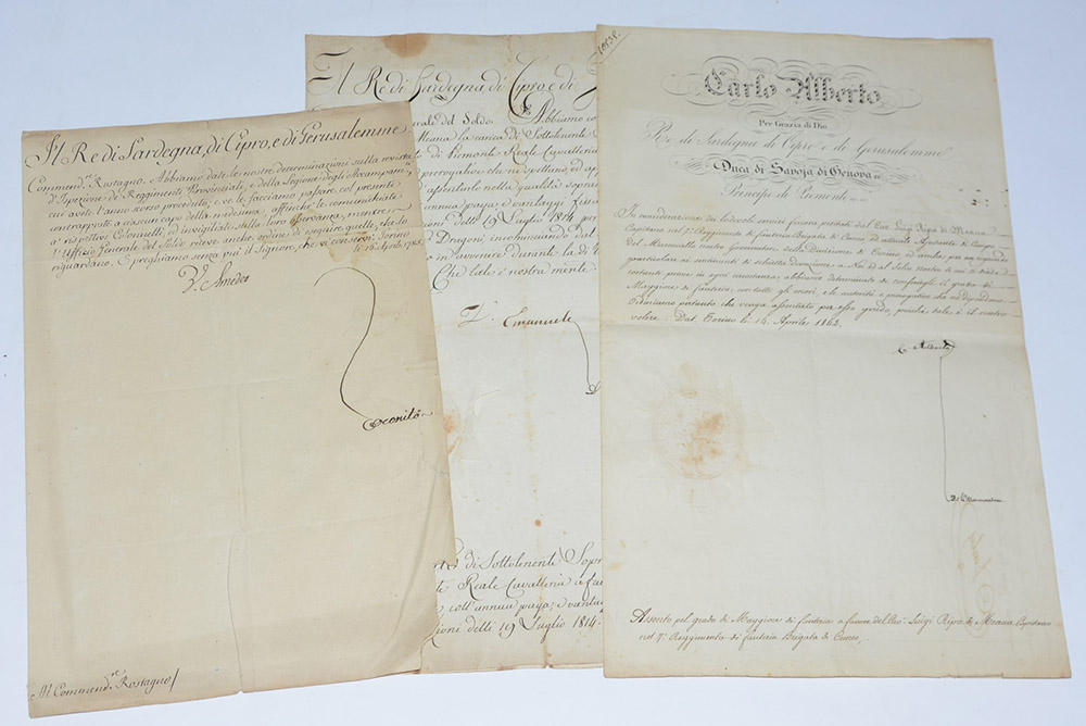 Lotto di tre documenti manoscritti di interesse storico, datati ai secoli XVIII-XIX (lievi difetti).