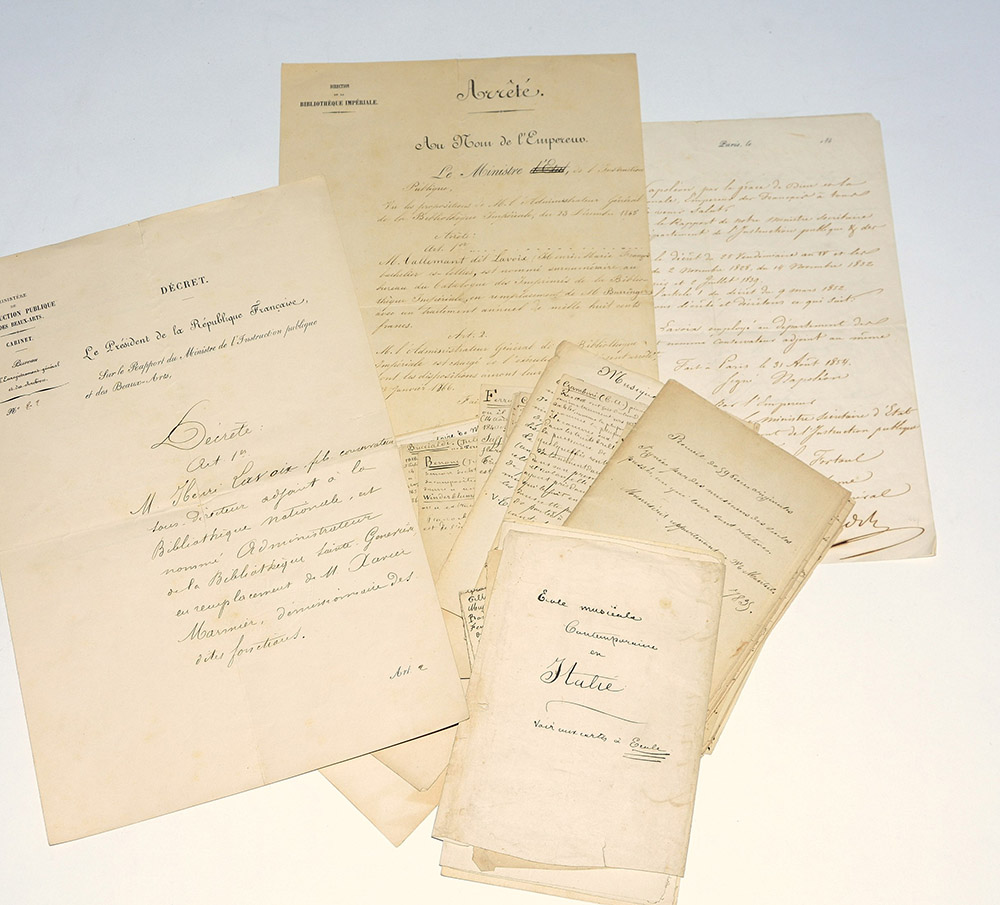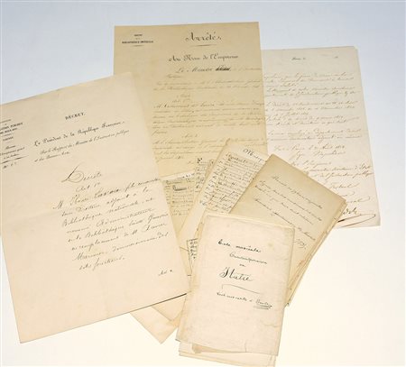 (Libri) Lotto composto da diversi scritti (manoscritti) di M. Henri Lavoix, autore di opere relative alla storia della musica; si aggiungono alcuni documenti relativi all'autore (difetti).