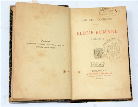 D'ANNUNZIO, Gabriele. Elegie Romane [1887-1891]. Bologna: Nicola Zanichelli, 1892. Prima edizione. Volume 12vo. Legatura in mezza pelle (lievi difetti).