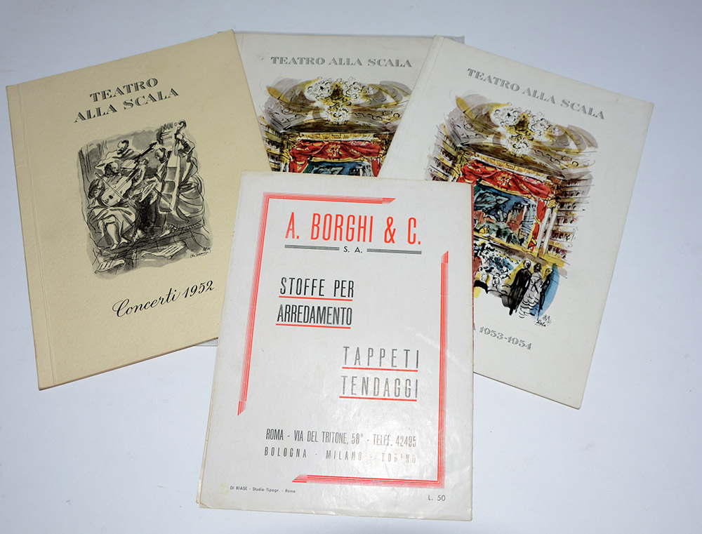 Lotto composto da quattro programmi teatrali a stampa autografati da famose personalità del mondo dello spettacolo, fra cui Vittorio Gassman, Evi Maltagliati, Ingrid Bergman, Roberto Rossellini e Leonard Bernstein. Si aggiunge un piccolo bigliettino d'auguri autografo di Silvia Altenburger. In ottimo stato.