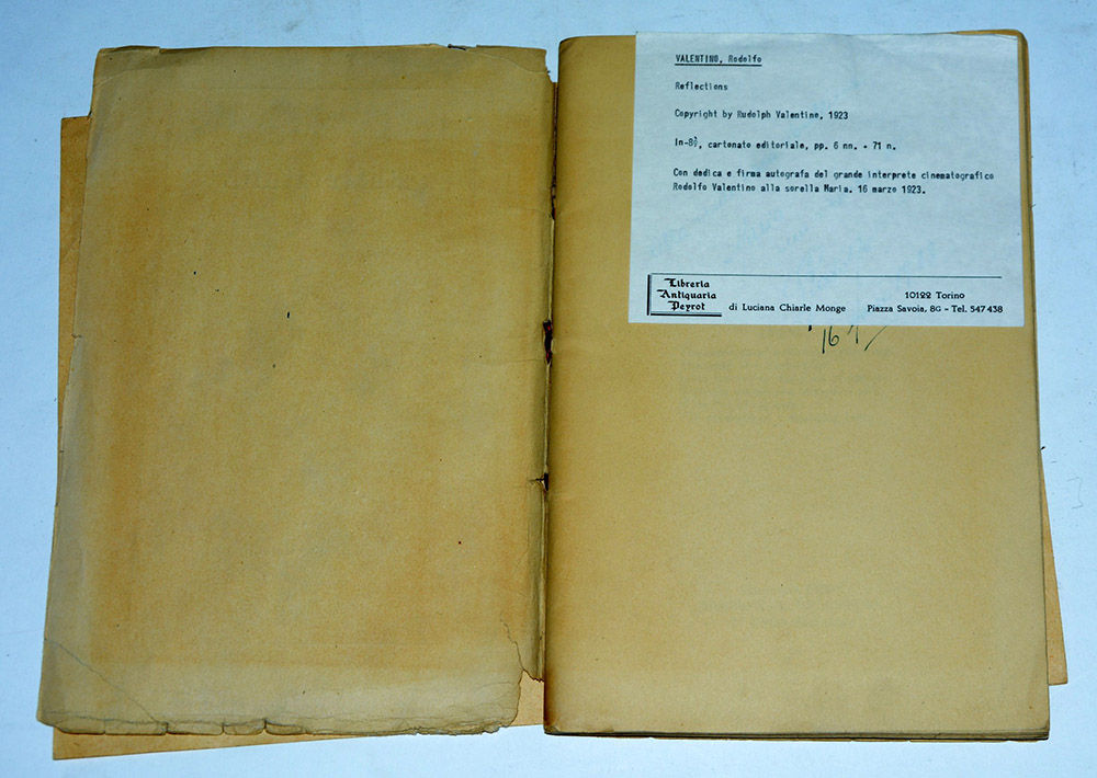 VALENTINO, Rudolph. Reflections. [Chicago]: [Champlin Law Print. Co.], 1923. Con dedica autografa "Alla mia cara sorellina Maria un ricordo di Rodolfo 16 marzo 1923". Legatura editoriale.