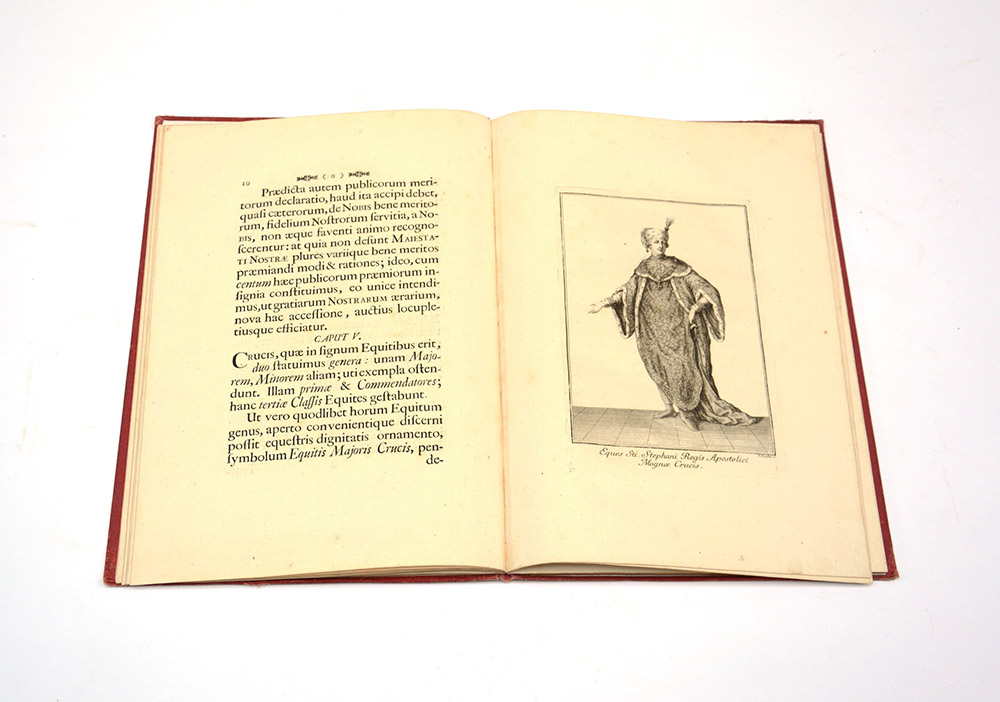 Constitutiones insignis ordinis equitum S. Stephani regis Apostolici. Vienna: Joseph Kurzbock, 1764. Volume in folio. Sei belle incisioni in bianco e nero; lunga nota manoscritta al frontespizio. Legatura recente in piena tella rossa e taglio in oro (lievi difetti).