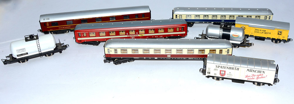 Cartone contenente numerose carrozze passeggeri e carrozze merci di trenino elettrico (difetti)