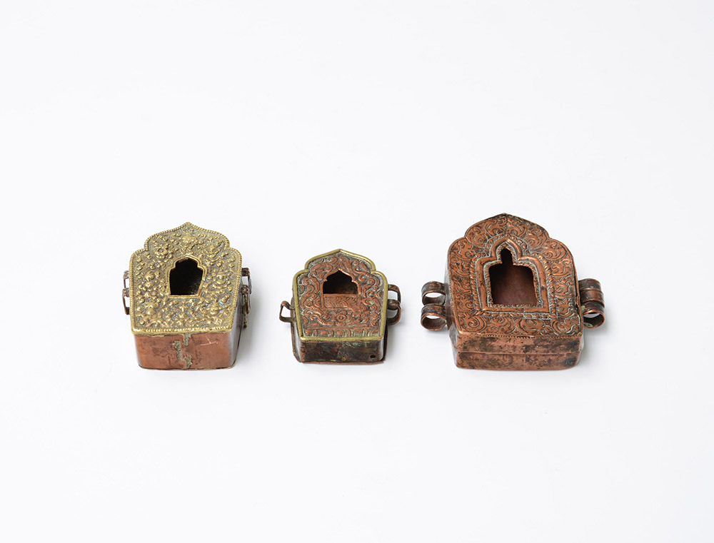 Lotto di tre portareliquie in rame e bronzo dorato con decorazione in rilievo (h max cm 10)(difetti) cina, fine del secolo XIX-inizio delsecolo XX
