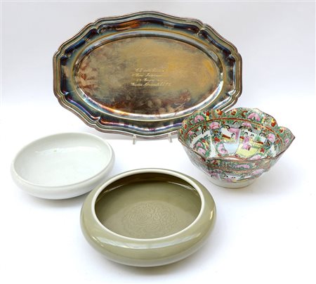 Lotto vario composto da una ciotola cinese con bordi polilobati, due contenitori in ceramica e un vassoio in metallo argentato (difetti)