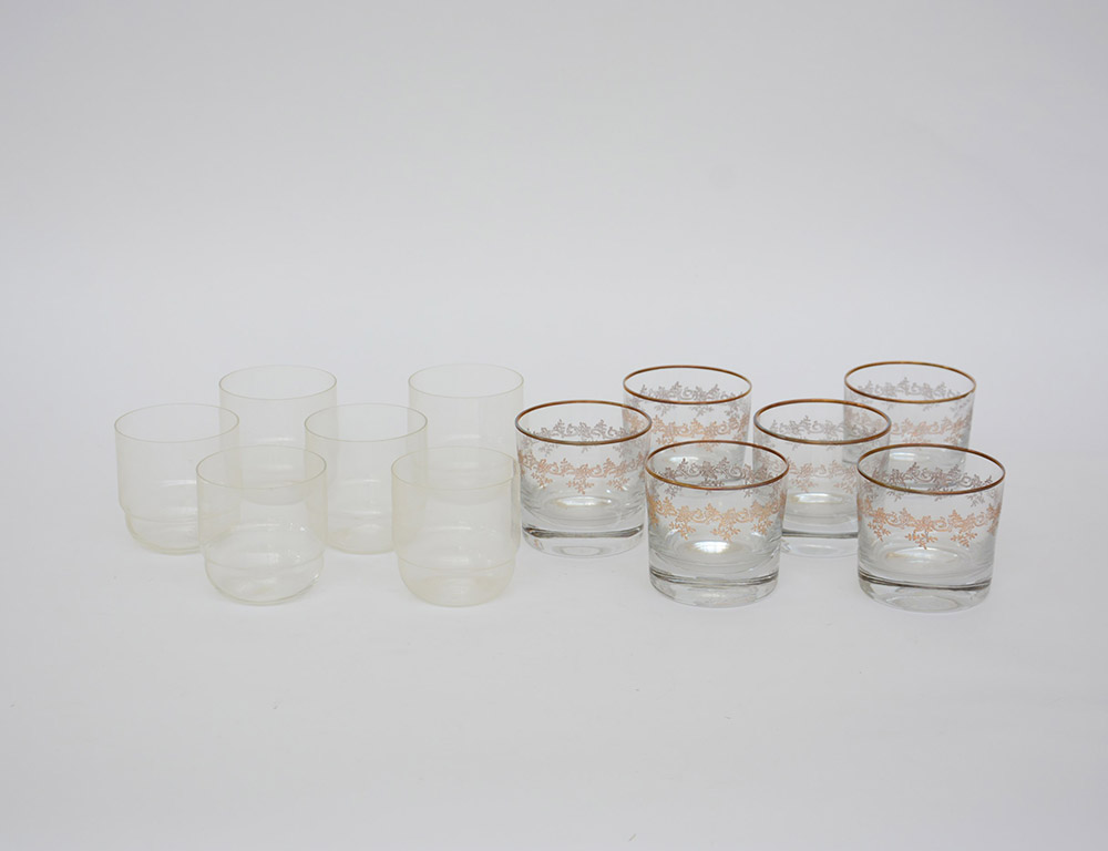 Lotto composto da sei bicchieri in vetro della manifattura di Rosenthal e dodici in vetro decorato a fregi dorati