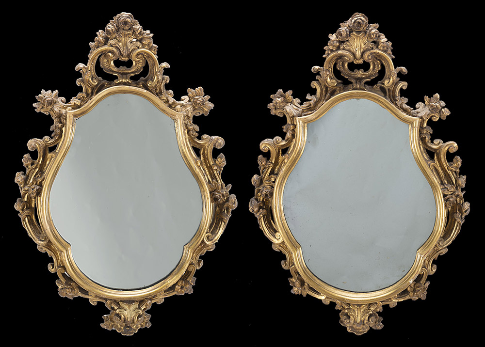 Coppia di specchiere di forma mossa in legno scolpito e dorato, pendenti di foglie e fiori ai lati, la cimasa traforata (cm 60x44) Sec. XVIII (difetti e restauri)