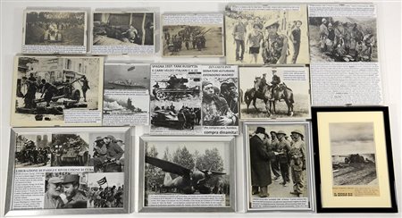 Lotto di numerose fotografie e ritagli di giornale sotto vetro, inerenti fatti bellici