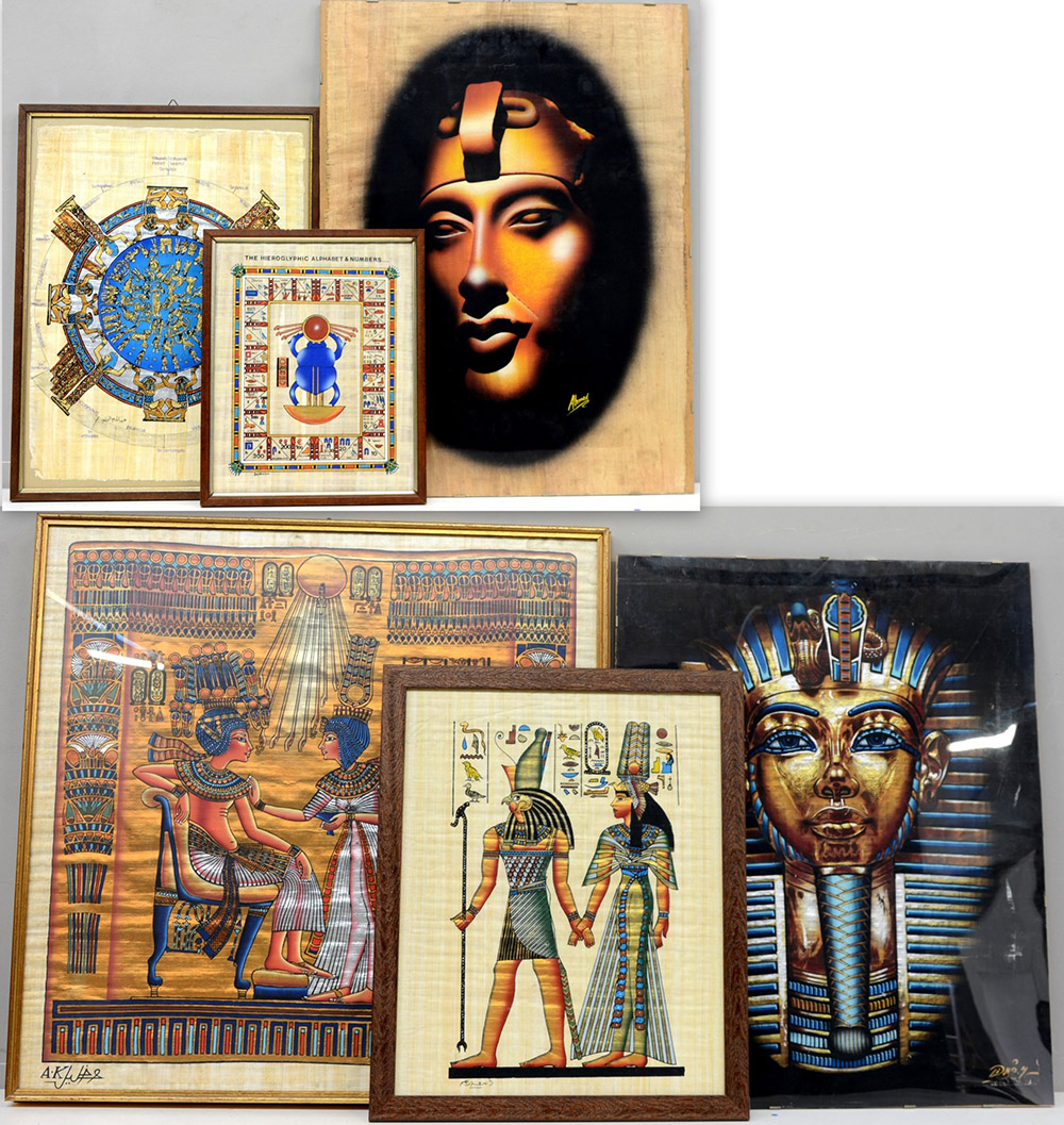 Lotto composto da sei quadri raffiguranti figure dell'antico Egitto, tecniche e misure differenti, in cornici (lievi difetti)